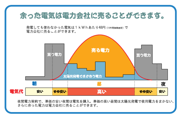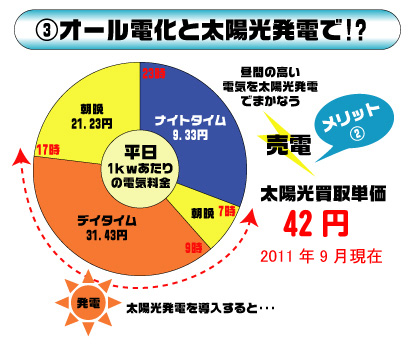 オール電化に併せて太陽光発電を導入されるともっとお得!ナイトタイムは9.33円、エコキュートはこの時間帯の割安な電気でお湯を沸かすのでお得です。朝晩の時間帯には掃除や洗濯、IHなどをよく使う時間帯です。昼間の電気は割高ですが、その時間帯に太陽光発電で昼間の高い電気をまかないます。さらに電機が余ったら42円で売電できるので、電気の使い方によっては電気代がマイナスになる可能性もあります。(太陽光パネルの発電量にもよります。)