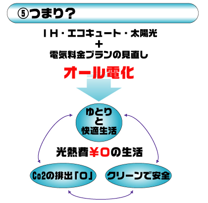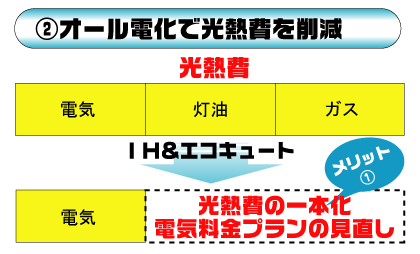 ・電気)を電気のみに一本化するものです。月々の基本料金だけを考えても断然お得です。ボイラー等をエコキュートに、ガスレンジをIHクッキングヒーターに切り替えます。