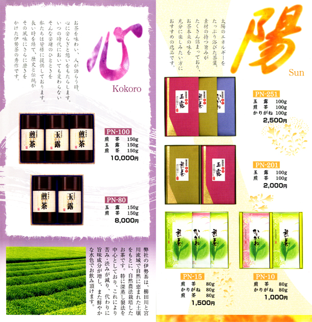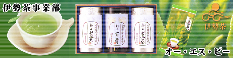 伊勢茶は、奥秘境大台ヶ原の源、櫛田川と宮川流域で自然に恵まれた古成層の土壌をもとに、松坂牛の堆肥等を使用し、自然農法栽培したお茶です。茶葉芽自体に「勢」があるため葉肉が厚く、アルカリ性アミノ酸やビタミンCを多く含んだ、香り豊かで味わい深いお茶が特徴です。また豊かな味・香りを保つために、火入れに工夫しております。お茶はガンの予防、動脈硬化や高血圧に効果があり、私たちが長年求めてきた真の自然飲料なのです。オー・エス・ピーでは、三重県多気町「(株)川原製茶」と提携し、伊勢茶をお届けしております。